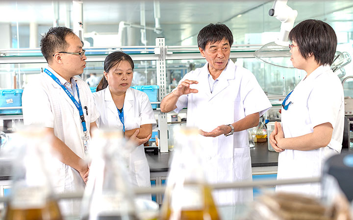晨光生物董事長(cháng)兼總經(jīng)理盧慶國(右二)與黨員、技術(shù)骨干奮戰在科技創(chuàng )新一線(xiàn)。